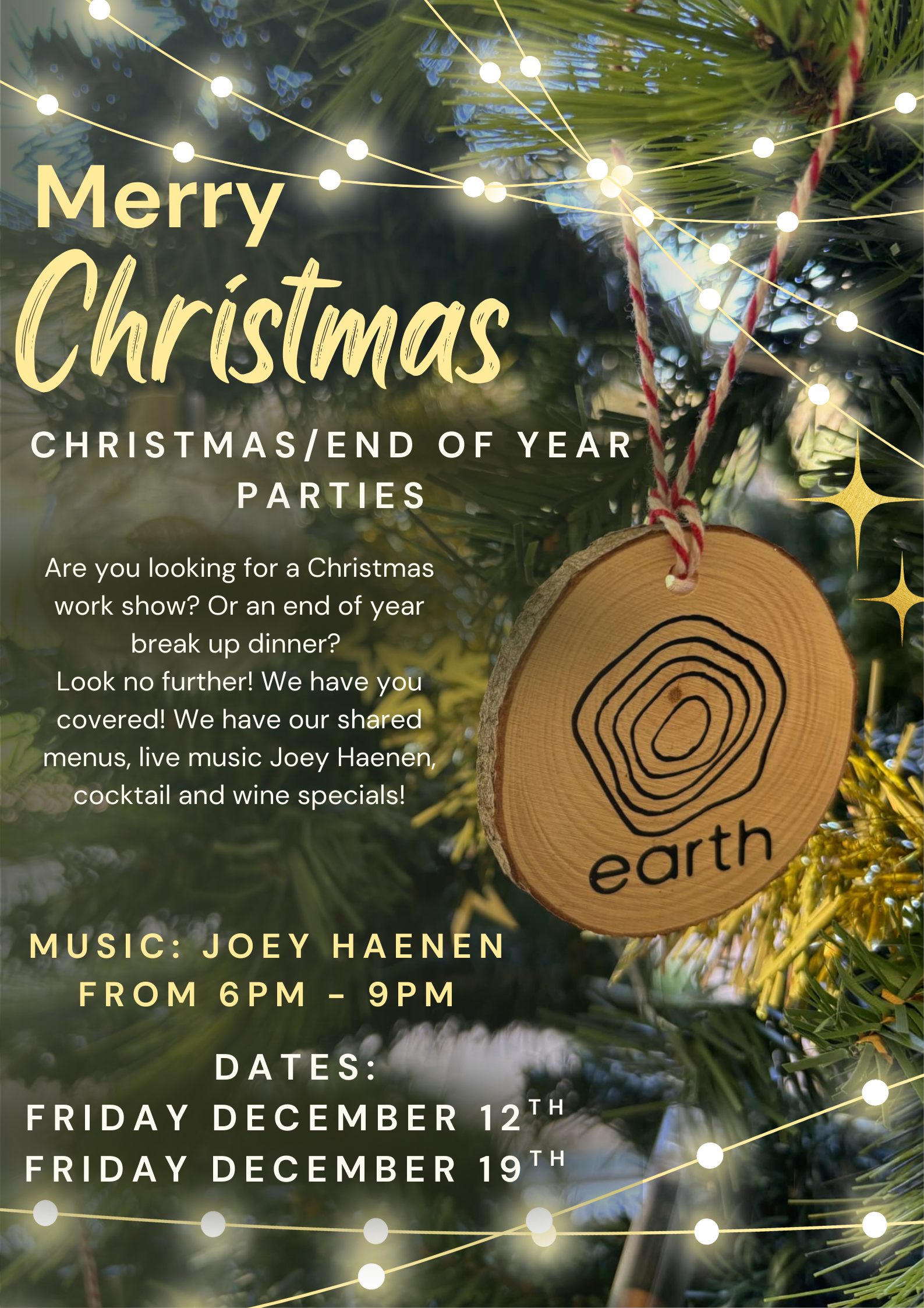Christmas is coming fast and we are switching it up this year! We have two nights dedicated to End of Year parties and Christmas Dinners. We are opening on December 12th and December 19th with a shared menu! We will have cocktail specials, a special shared menu, Christmas theme drinks and Live Music by Joey Haenen from 6pm - 9pm. Spaces are limited so book your table now!